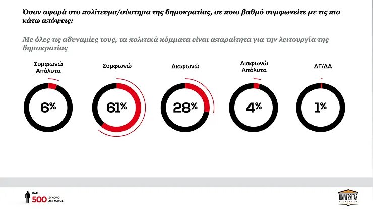 Την ερμηνεία αυτή ενισχύουν και οι απαντήσεις σε ένα άλλο ερώτημα, για τη σημασία των πολιτικών κομμάτων στη λειτουργία της δημοκρατίας: ένα ποσοστό της τάξης του 32% δεν θεωρεί τα κόμματα απαραίτητα!