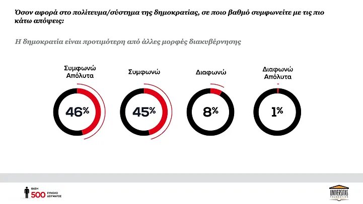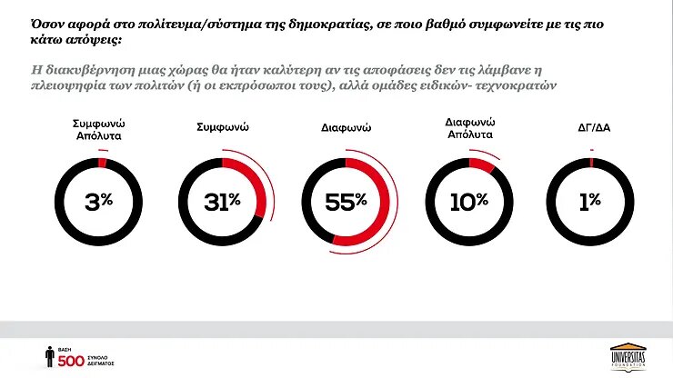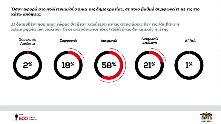 Όταν όμως μπαίνει το ερώτημα κατά πόσον η διακυβέρνηση θα ήταν καλύτερη αν τις αποφάσεις τις έπαιρνε ένας «δυναμικός ηγέτης» αντί οι πολίτες ή οι εκπρόσωποί τους, ένα σημαντικό ποσοστό του 20% συμφωνεί! Ακόμη πιο μεγάλο είναι το ποσοστό (34%) που θεωρούν πως η διακυβέρνηση της χώρας θα ήταν καλύτερη αν τις έπαιρναν ομάδες «ειδικών-τεχνοκρατών»!
