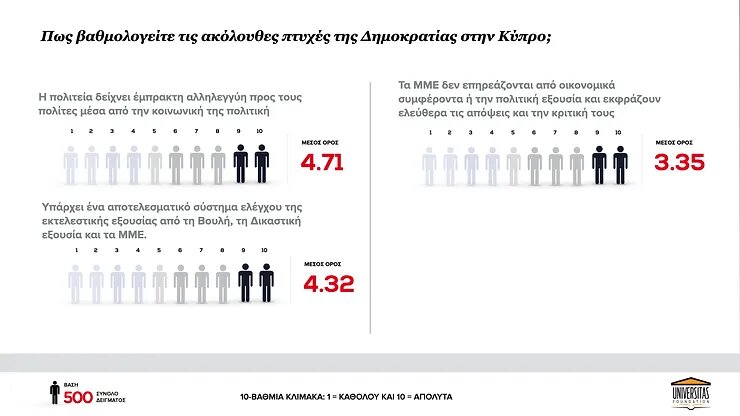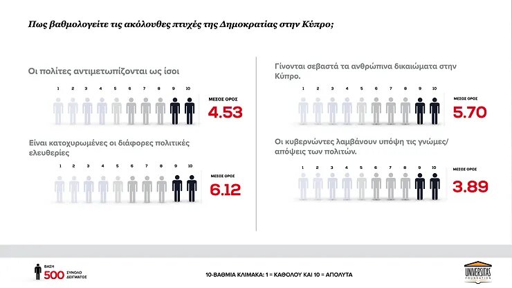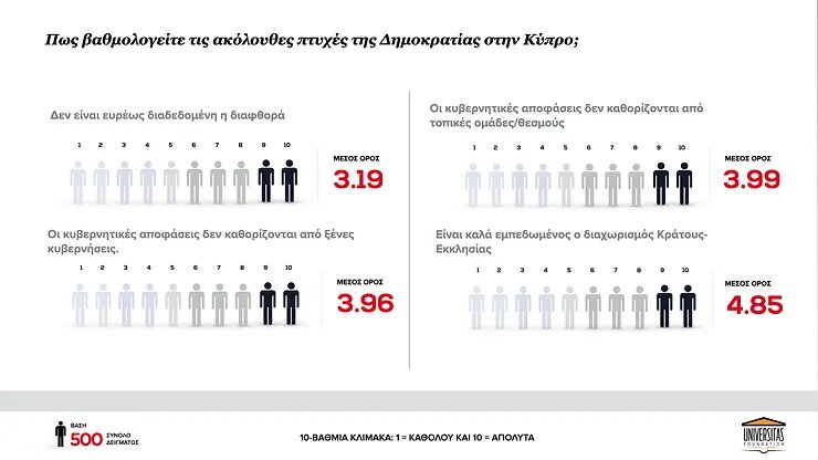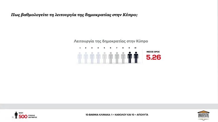 Είναι φανερό πως ενώ υπάρχει μια καθολική αποδοχή της δημοκρατίας ως ιδέας και ως του ιδανικότερου συστήματος διακυβέρνησης, υπάρχει ταυτόχρονα μια μεγάλη δυσπιστία ως προς την λειτουργία των διαφόρων πτυχών της δημοκρατίας στον τόπο. Μάλιστα, σε επόμενο ερώτημα για μια πιο γενική αξιολόγηση της λειτουργίας της δημοκρατίας στην Κύπρο, η βαθμολογία που δίνουν είναι 5.26: μια βαθμολογία πολύ πιο αυστηρή από εκείνην που είδαμε να δίνει στην Κύπρο ο Economist (7.43).