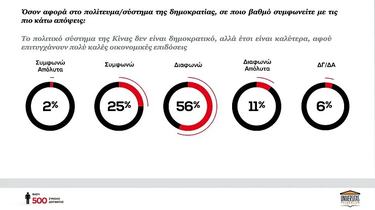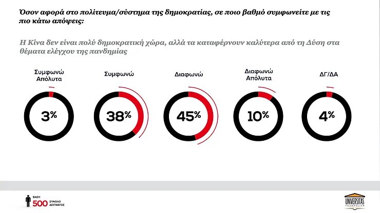 Πόσο επηρεάζονται οι Κύπριοι από την απόδοση άλλων, μη δημοκρατικών συστημάτων στο εξωτερικό; Το δείγμα ρωτήθηκε για τη μεγάλη οικονομική ανάπτυξη στης Κίνας τις τελευταίες δεκαετίες, σε βαθμό που να έχει καταστεί η δεύτερη πιο ισχυρή οικονομία στον κόσμο, πλην όμως βασιζόμενη σε ένα αυταρχικό, συγκεντρωτικό πολιτικό σύστημα. Όντως, ένας στους τέσσερις Κύπριους δικαιολογεί την αυταρχική διακυβέρνηση που συνοδεύεται από εντυπωσιακές οικονομικές επιδόσεις. Ακόμη πιο εντυπωσιακό είναι πως το 41% των Κυπρίων φαίνεται πως δικαιολογεί τον αυταρχισμό της Κίνας στον χειρισμό της πανδημίας, αφού αυτό έφερε πιο αποτελεσματικό έλεγχο σε σχέση με τους χειρισμούς των δυτικών χωρών.