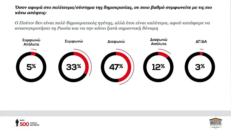 Τέλος, παρόμοια θετική στάση φαίνεται να υιοθετεί το 38% των Κυπρίων απέναντι στον αυταρχισμό του Pώσου προέδρου, Βλαντιμίρ Πούτιν, αφού αυτός ήταν που του επέτρεψε να ανασυγκροτήσει τη χώρα του και να την καταστήσει και πάλι σημαντική δύναμη.