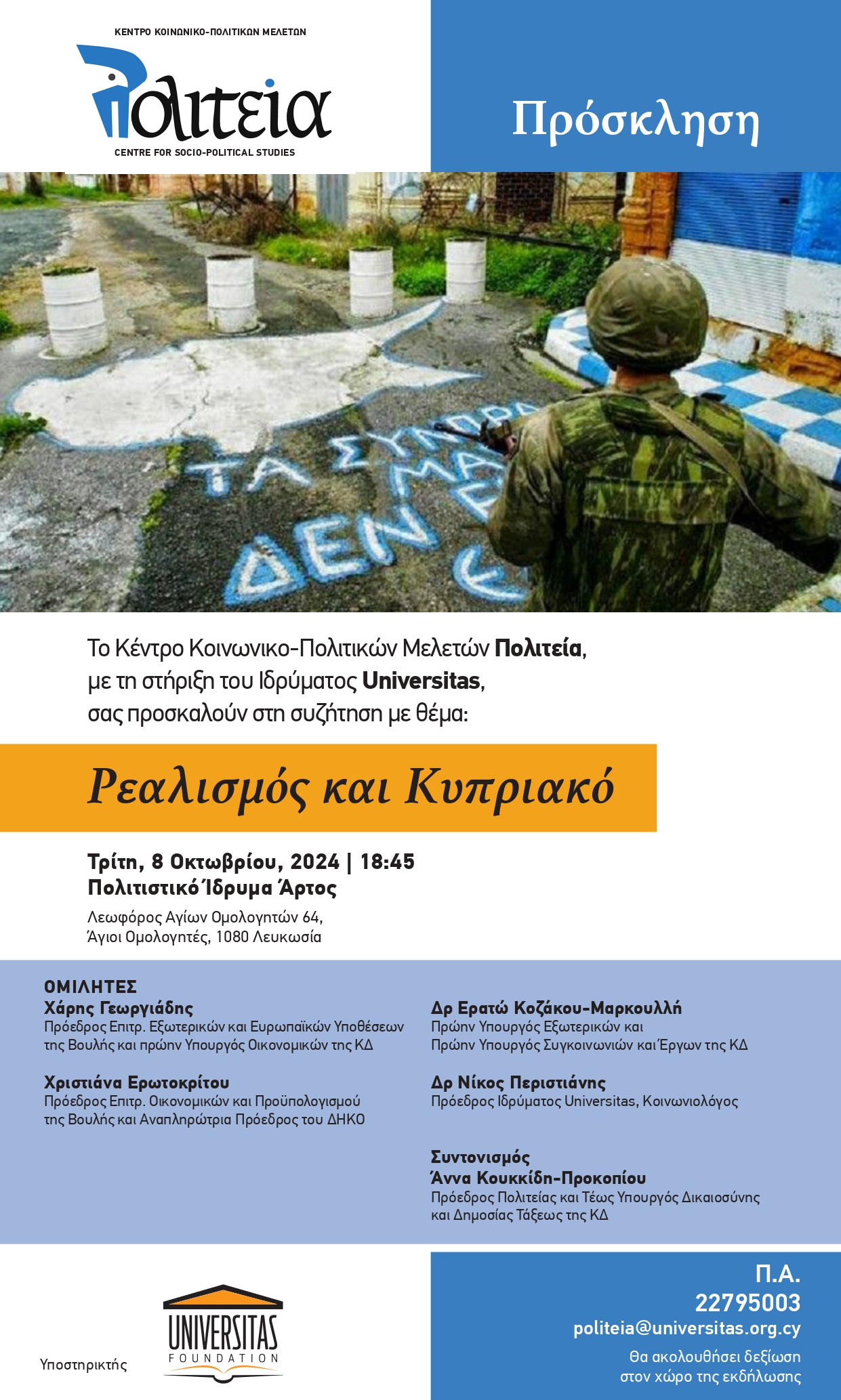 Το Κέντρο Κοινωνικο-Πολιτικών Μελετών Πολιτεία, με τη στήριξη του Ιδρύματος Universitas, σας προσκαλούν στη συζήτηση με θέμα: Ρεαλισμός και Κυπριακό